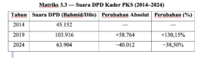Paradoks semakin kuat ketika melihat arena DPD. Pada 2014 suara DPD yang beririsan dengan jejaring PKS mencapai 45.152 suara. Pada 2019, Abdurrahman Bahmid—kader PKS—melonjak hingga 103.916 suara, dan pada 2024 Jasin Dilo—juga kader PKS—meraih 63.904 suara. Lonjakan ini menunjukkan bahwa PKS memiliki figur dengan legitimasi moral dan sosial yang kuat. Namun suara besar tersebut tidak bergerak linier dengan suara DPR RI maupun akumulasi kursi DPRD, sehingga menegaskan adanya keterputusan antara kemenangan figur dan penguatan institusional partai.