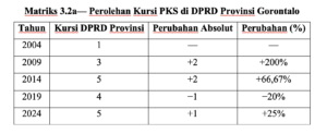 Sebaliknya, di DPRD Provinsi Gorontalo PKS menunjukkan ketahanan yang relatif stabil. Dari 1 kursi pada 2004, meningkat menjadi 3 kursi pada 2009, mencapai 5 kursi pada 2014, turun menjadi 4 kursi pada 2019, dan kembali ke 5 kursi pada 2024. Stabilitas ini menandakan keberhasilan mempertahankan basis lokal, tetapi sekaligus menunjukkan keterbatasan ekspansi, karena kenaikan tidak berlanjut menjadi pertumbuhan signifikan.
